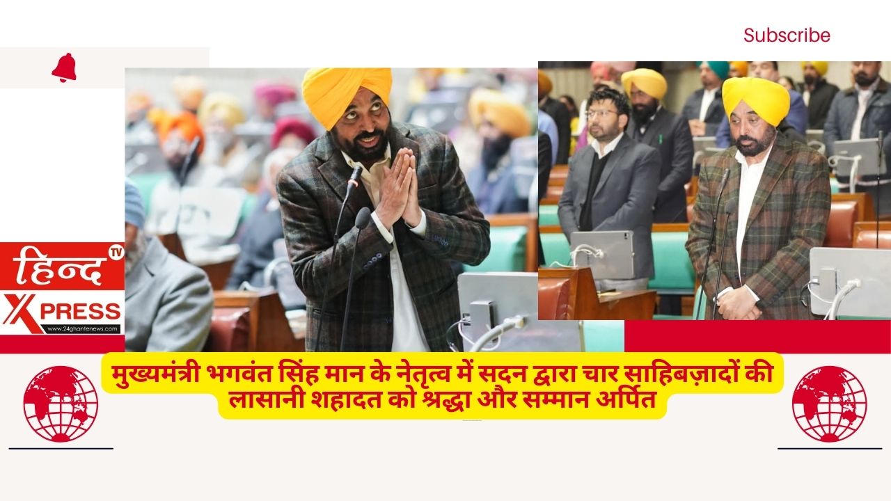 पंजाब विधानसभा के विशेष सत्र के दौरान आज सदन ने चार साहिबज़ादों की लासानी शहादत को नमन किया, जिससे ज़बर-जुल्म के विरुद्ध डटकर खड़े रहने वाली पंजाब की महान विरासत का दृढ़ प्रदर्शन हुआ। मुख्यमंत्री भगवंत सिंह मान के नेतृत्व में पंजाब विधानसभा के सदन ने आज दसवें पातशाह श्री गुरु गोबिंद सिंह जी के चार साहिबज़ादों—बाबा अजीत सिंह जी, बाबा जुंझार सिंह जी, बाबा ज़ोरावर सिंह जी और बाबा फतेह सिंह जी—को श्रद्धा और सम्मान अर्पित किया। इस अवसर पर सदन ने माता गुजरी जी, बाबा जीवन सिंह जी, बाबा संगत सिंह जी, दीवान टोडर मल जी तथा अन्य शहीदों को भी स्मरण किया।