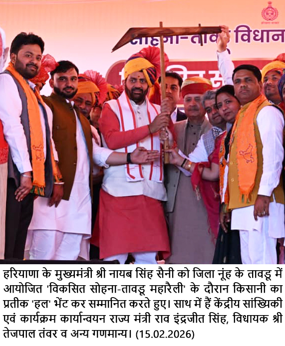 चंडीगढ़,15 फरवरी- हरियाणा के मुख्यमंत्री श्री नायब सिंह सैनी ने कहा कि अरावली की गोद में बसा तावडू क्षेत्र अपने मेहनती, स्वाभिमानी और संघर्षशील लोगों के लिए पूरे प्रदेश में जाना जाता है। मेवात की धरती ने सदैव साहस, बलिदान और स्वाभिमान की परंपरा को आगे बढ़ाया है। सन् 1857 की आजादी की प्रथम लड़ाई से लेकर आजादी मिलने तक के संघर्ष में यहां के लोगों ने जो भूमिका निभाई, वह इतिहास के पन्नों पर स्वर्ण अक्षरों में अंकित है।