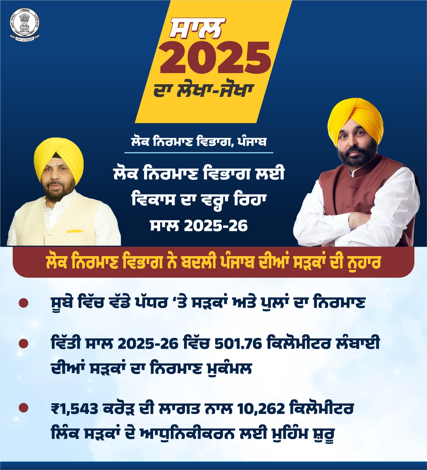 मुख्यमंत्री भगवंत सिंह मान के नेतृत्व वाली पंजाब सरकार द्वारा प्रदेश को रंगला पंजाब बनाने की दिशा में तथा इसके सर्वपक्षीय विकास के लिए लगातार प्रयास किए जा रहे हैं। इसी कड़ी के तहत पंजाब सरकार के लोक निर्माण विभाग द्वारा प्रदेश के निवासियों के लिए बेहतरीन सड़क नेटवर्क उपलब्ध करवाने के लिए लगातार काम किया जा रहा है।
