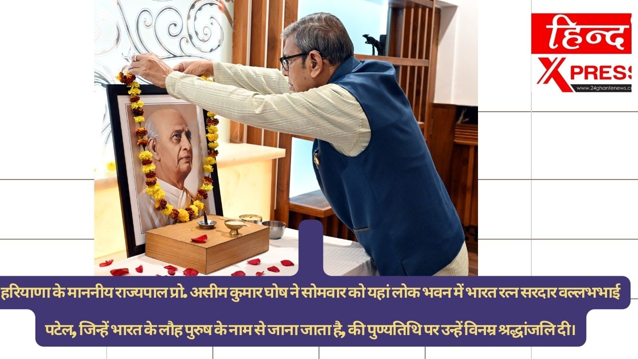 चंडीगढ़, 15 दिसंबर, 2025- हरियाणा के माननीय राज्यपाल प्रो. असीम कुमार घोष ने सोमवार को यहां लोक भवन में भारत रत्न सरदार वल्लभभाई पटेल, जिन्हें भारत के लौह पुरुष के नाम से जाना जाता है, की पुण्यतिथि पर उन्हें विनम्र श्रद्धांजलि दी।