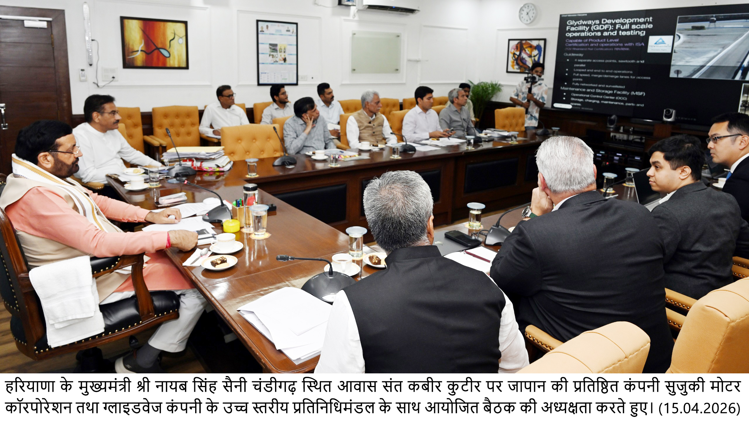इसी कड़ी में मुख्यमंत्री श्री नायब सिंह सैनी से बुधवार को चंडीगढ़ स्थित संत कबीर कुटीर में जापान की प्रतिष्ठित कंपनी सुजुकी मोटर कॉरपोरेशन तथा ग्लाइडवेज कंपनी के उच्च स्तरीय प्रतिनिधिमंडल ने शिष्टाचार भेंट की। बैठक के दौरान हरियाणा सरकार और जापानी कंपनियों के बीच ग्लाइडवेज ट्रांजिट प्रोजेक्ट को लेकर संभावित साझेदारी के विभिन्न पहलुओं पर विस्तार से विचार-विमर्श किया गया।