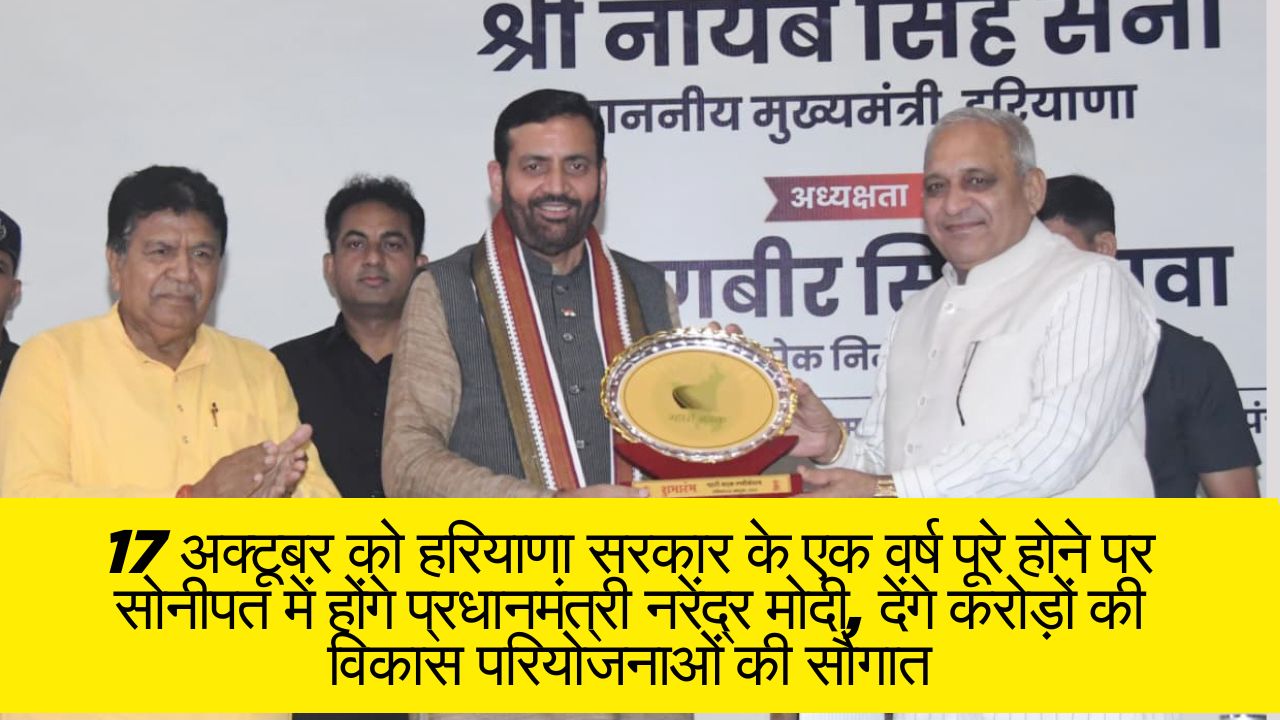बैठक में बताया गया कि 17 अक्टूबर को सोनीपत में एक राज्यस्तरीय भव्य कार्यक्रम आयोजित किया जाएगा, जिसमें प्रधानमंत्री नरेंद्र मोदी मुख्य अतिथि के रूप में शामिल होंगे। प्रधानमंत्री इस अवसर पर प्रदेशवासियों को करोड़ों रुपये की विकास परियोजनाओं की सौगात देंगे।