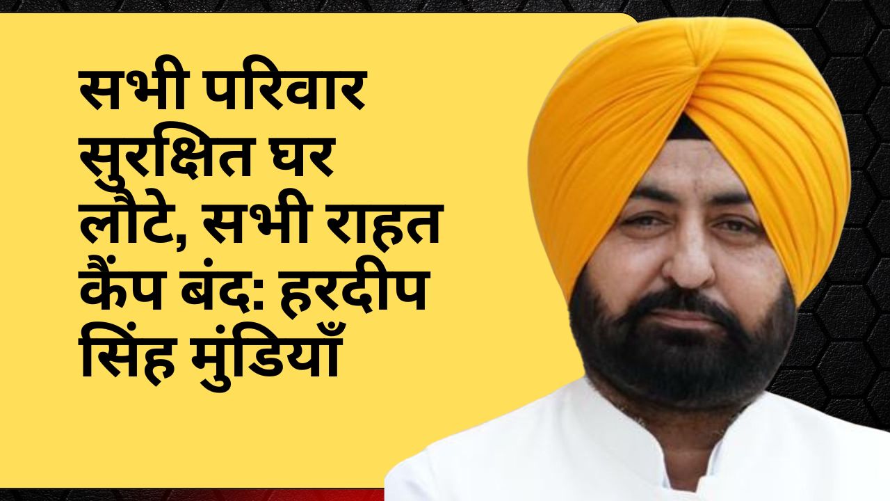 पंजाब के राजस्व, पुनर्वास और आपदा प्रबंधन मंत्री हरदीप सिंह मुंडियाँ ने बताया कि प्रदेश में बाढ़ की स्थिति अब पूरी तरह स्थिर हो चुकी है। इसके साथ ही राज्यभर में चल रहे सभी राहत कैंप बंद कर दिए गए हैं, क्योंकि इनमें रह रहे प्रभावित परिवार सुरक्षित अपने घरों को लौट चुके हैं। हालांकि, उन्होंने आश्वासन दिया कि प्रभावित लोगों को आवश्यक राहत सामग्री और मदद लगातार मिलती रहेगी।