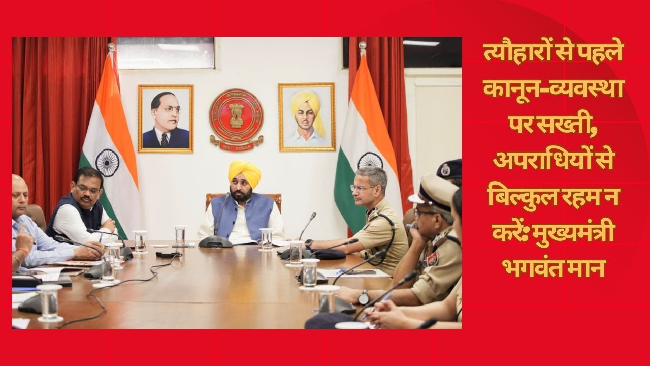 पंजाब के मुख्यमंत्री भगवंत सिंह मान ने राज्य की कानून-व्यवस्था की समीक्षा बैठक में स्पष्ट निर्देश दिए कि अपराध और शांति भंग करने वाले तत्वों के साथ किसी भी प्रकार की नरमी न बरती जाए। उन्होंने पुलिस आयुक्तों (सी.पी.) और वरिष्ठ पुलिस अधीक्षकों (एस.एस.पी.) से कहा कि आगामी त्यौहारों के मद्देनज़र सुरक्षा और प्रबंधन के व्यापक इंतज़ाम किए जाएं ताकि लोग सुरक्षित माहौल में पर्व मना सकें।